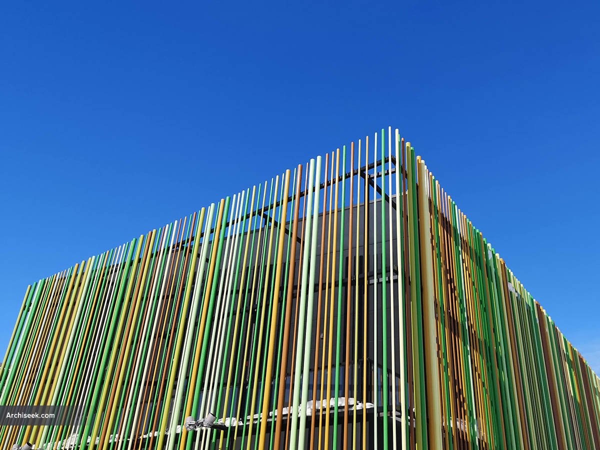Architect David Penner said of the facade: “On the one hand, the bars serve a privacy device, because the building is relatively close to the street. Also, we were trying to do something to suggest that the hotel was an extension of the park. (The hotel is immediately north of Stephen Juba Park.) We took the colours from trees and leaves and apply them to trunk-like pipes. In a very abstract way it’s not unlike looking at a forest.”