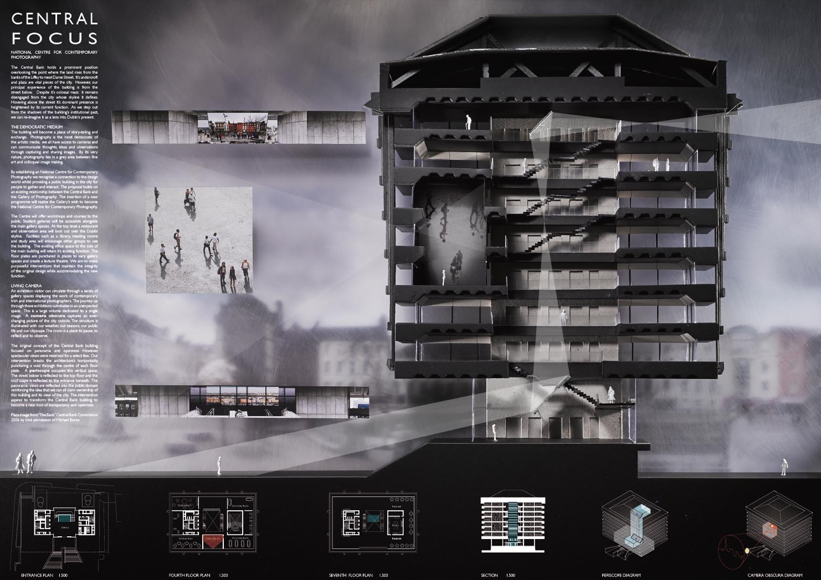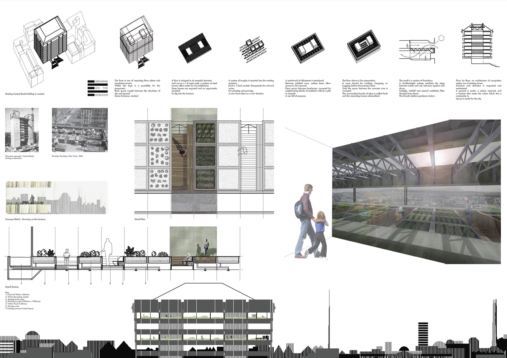 . Thir citation: “Central to this proposition is a reconfiguration of the central bank building as a structure which is spatially continuous with its public plaza. The presentation is succinct and provocative, presenting the bank in a state of partial destruction with a new semi-open park spiralling around the existing lift cores. The open platforms of the park are suspended, optimistically, from the retained roof truss. The presentation dispenses with conventional drawings and instead presents the proposal through a series of diagrams, two photo-montages and a sequence of wireframe perspectives. One key set of diagrams summarises the original construction sequence, with the proposal then presented as a partial reversal/rewinding of this process. The images and diagrams trigger a new perception of the building by exposing, x-ray like, the inventiveness of the original structure.”