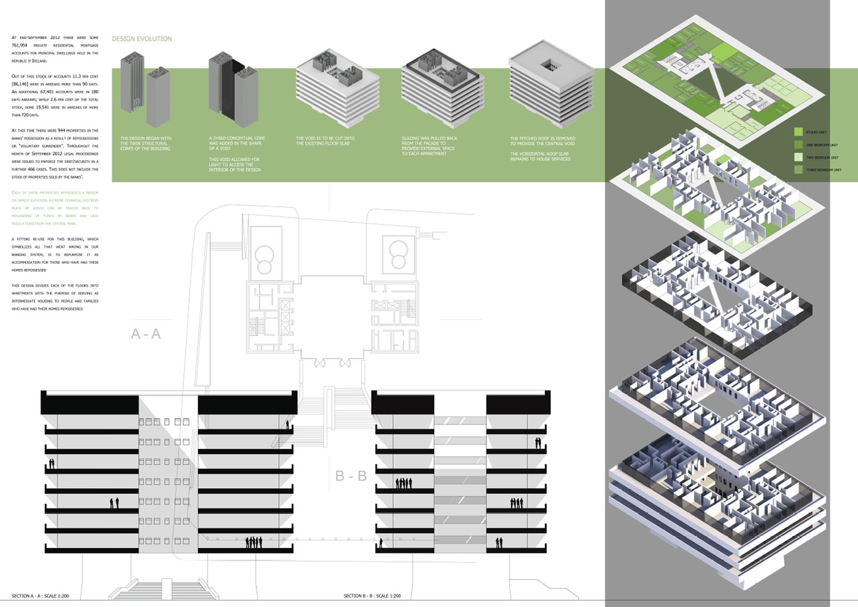 The graphic presentation is exceptionally strong, above all in the way that the section drawing encourages an understanding of the interior organization of an originally rather forbidding structure, which is here opened up to engage with the future of the larger society. The details of this proposal thus quite literally demystify and transform what has been the power and authority vested in one of Dublin’s most prominent buildings into a space of participatory activities that give access to opportunities for those at the beginning of their lives.