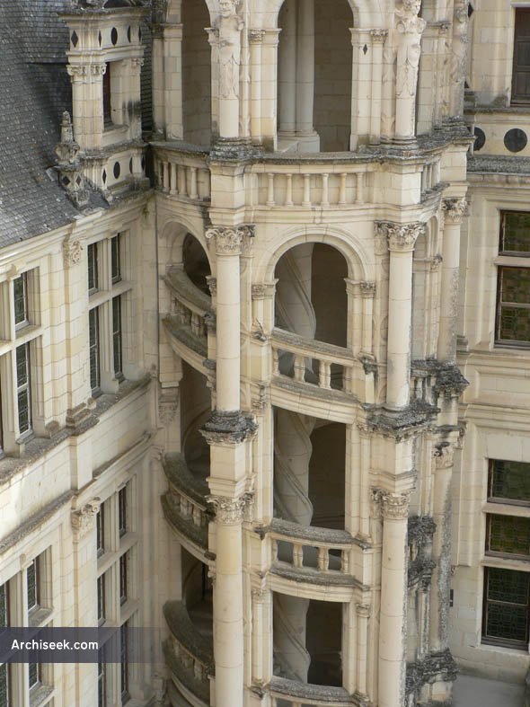 It has been suggested that Leonardo da Vinci, a guest of King François at Clos Lucé near Amboise, was responsible for the original design, which reflects Leonardo’s plans for a château at Romorantin for the King’s mother, and his interests in central planning and double helical staircases. One of the architectural highlights is the spectacular double-helix open staircase that is the centrepiece of the castle. The two helixes ascend the three floors without ever meeting, illuminated from above by a sort of light house at the highest point of the castle.