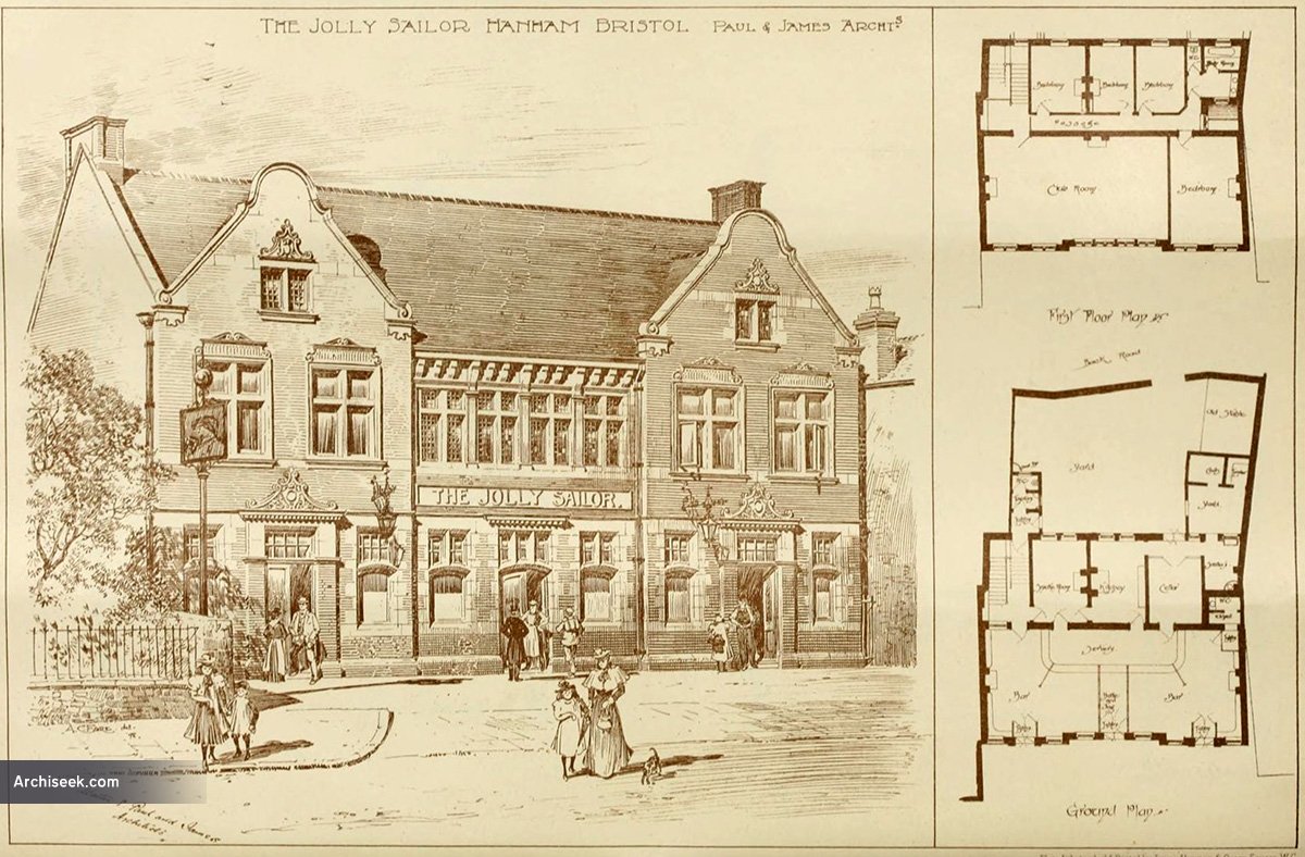 Still a public house, today but run by Wetherspoon. “This house has recently been erected at Hanham, near Bristol, for the Bristol Brewery, Georges and Co., Ltd. The materials of which the buildings are composed are local bricks with Bath- stone dressings, the roof being covered with Broseley tiles. The general contract was in the hands of Mr. J. Perkins, and the plumbing and sanitary works were carried out by Messrs. J. Hunter and Son, both of Bristol. Messrs. Walter S. Paul and James, AA.ll I.B.A., of Bristol, were the architects.” Published in The Building News, August 18 1899.